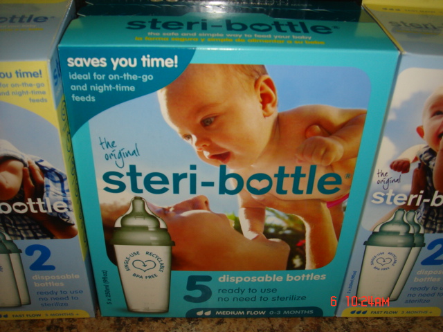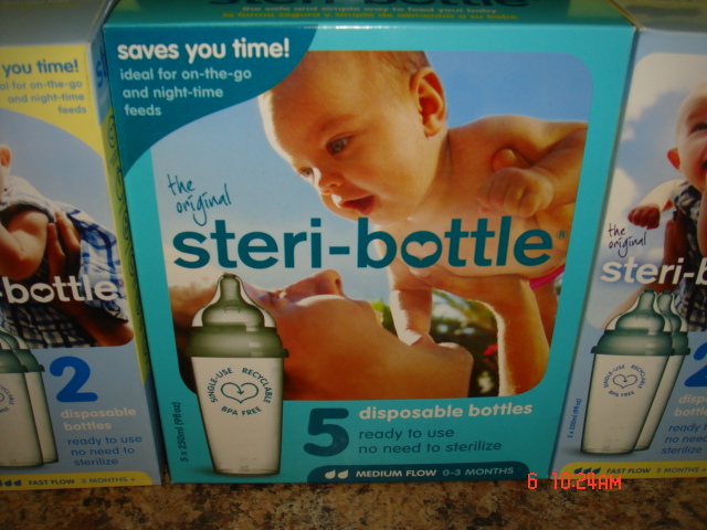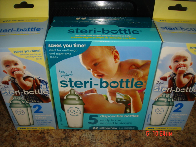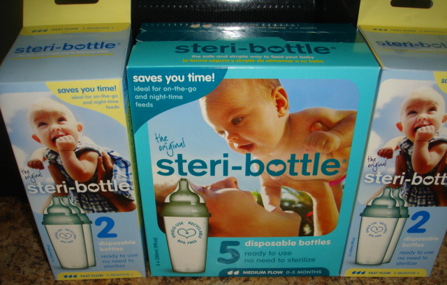 Steri-bottles are available in a two, five, and ten fast flow pack and a five pack medium flow pack. When you open the box you find the bottles in one pack and the nipples in another package. They even included a cover the nipple of the bottle. I was worried about the bottle leaking when use, but the top snaps on tight for a very secure seal. My son didn’t have any problems with using the bottles at all. They were light weight, easy for him to hold on his own and he didn’t have any nipple confusion when using these bottles compared to his regular bottles. Steri-bottles are 100% recyclable and BPA free. Steri-bottle would make great baby shower gifts and are perfect for parents with children who are still bottle feeding.