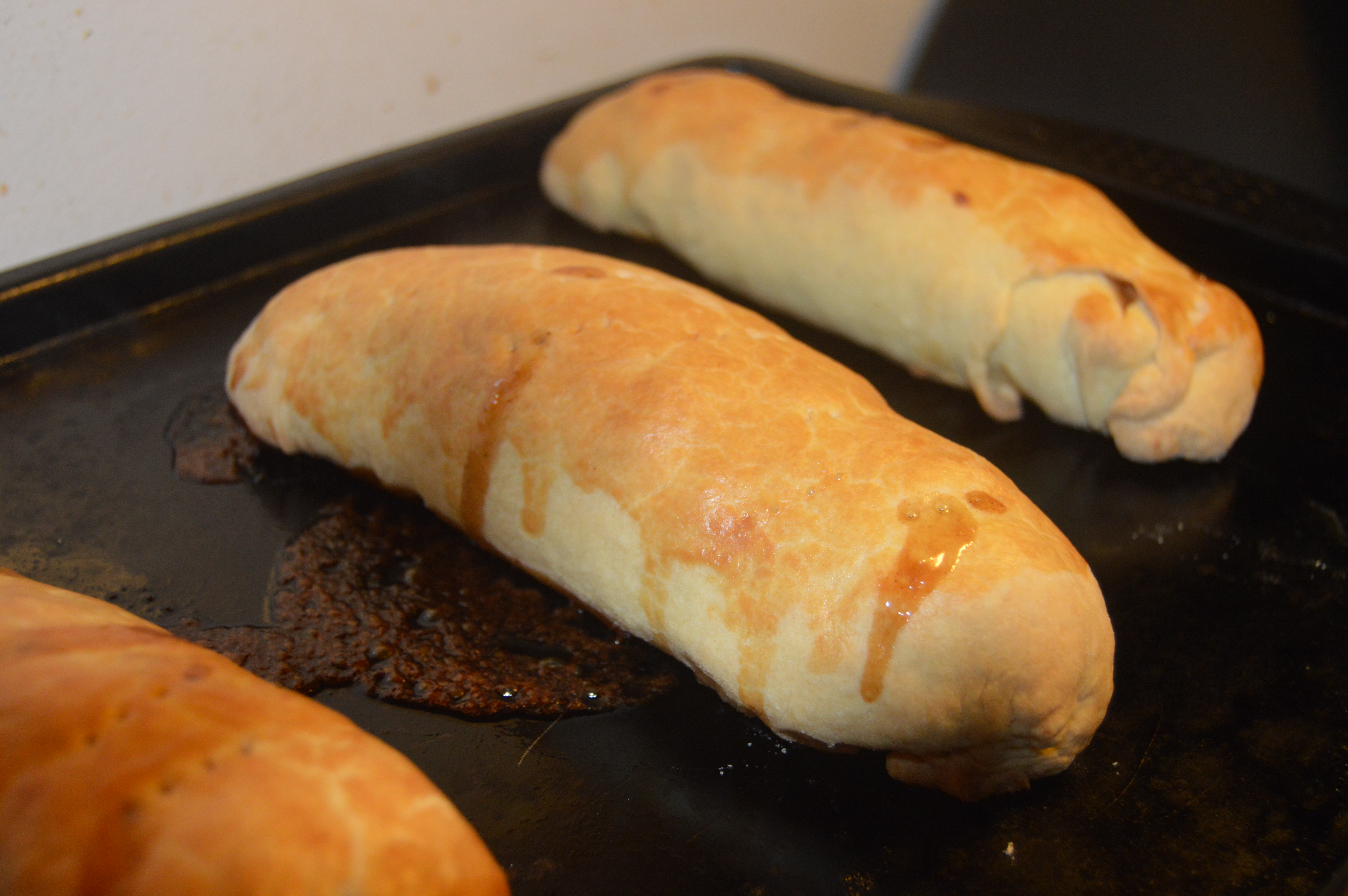 - Bake on a baking sheet for 35 minutes until golden brown. Check the rolls around 25 minutes to make sure the bottoms is not burning. Line the sheet with parchment paper since the filling may spill from the roll. This makes for easier cleanup.