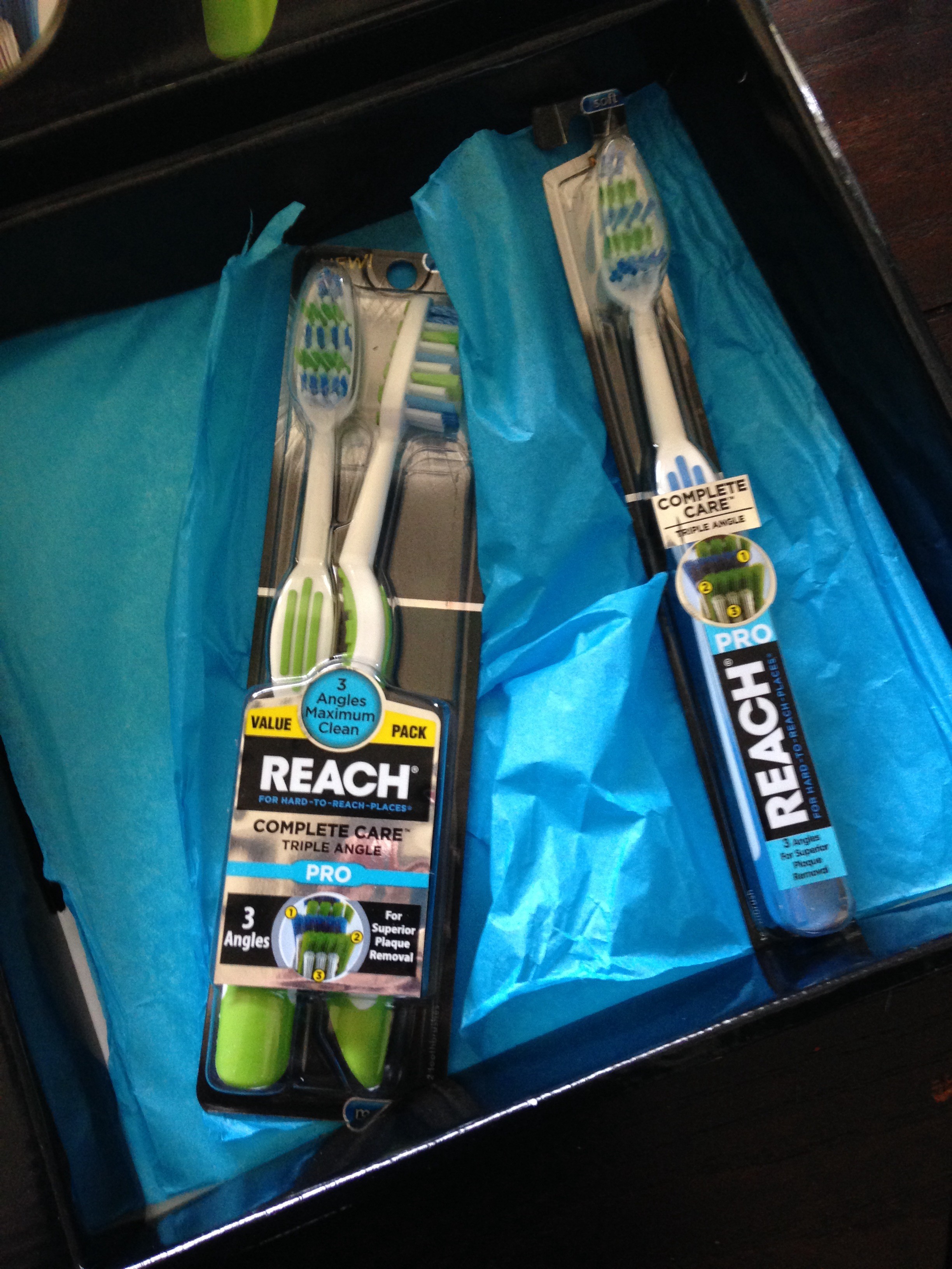 I’ve broken up with my old toothbrushes and I don’t think we’ll ever be making up again. My samples of REACH Complete Care arrived and it was perfectly timed. It was time for my four-month swap. I’ve been using the same brand of toothbrush for at least four years now, partly because when I was couponing I had a nice stock pile and I believed that they were working for me. The complete care line features two new triple angle brushes. So I had to decide which brush I would pick.
